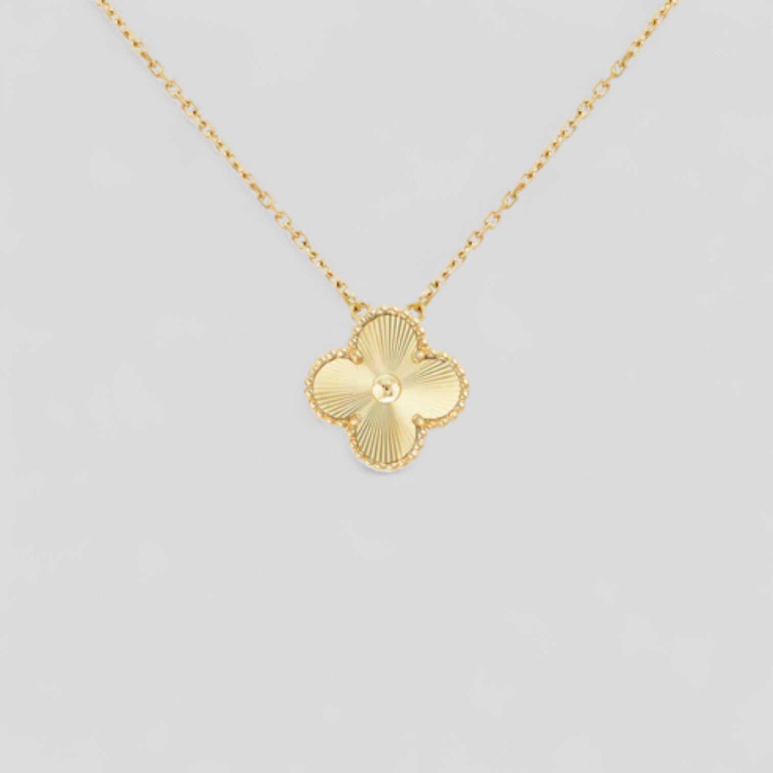 Este exquisito collar presenta un colgante en forma de flor estilizada, perfecto para realzar cualquier atuendo. La superficie suavemente estriada complementada con un engaste de perlas aporta una elegancia y profundidad únicas a su diseño.
