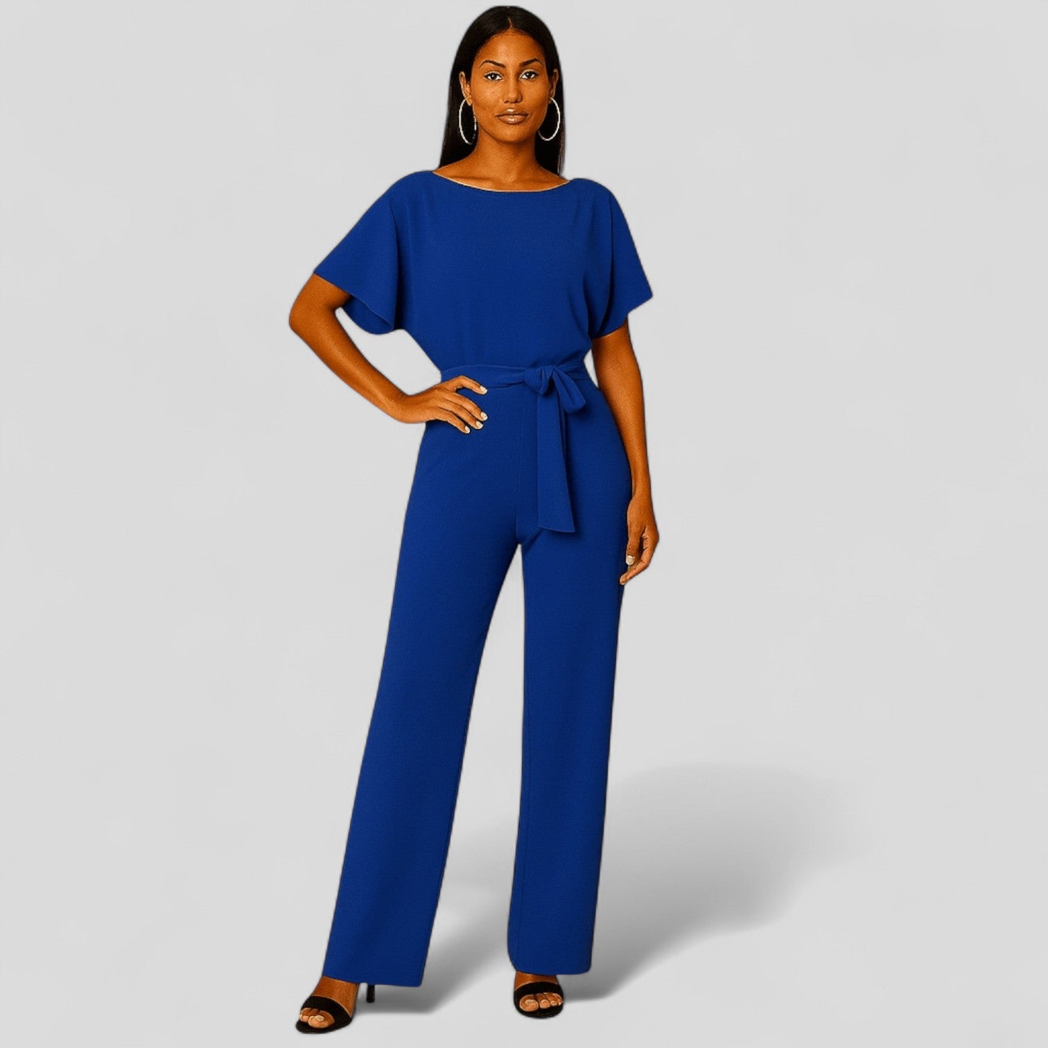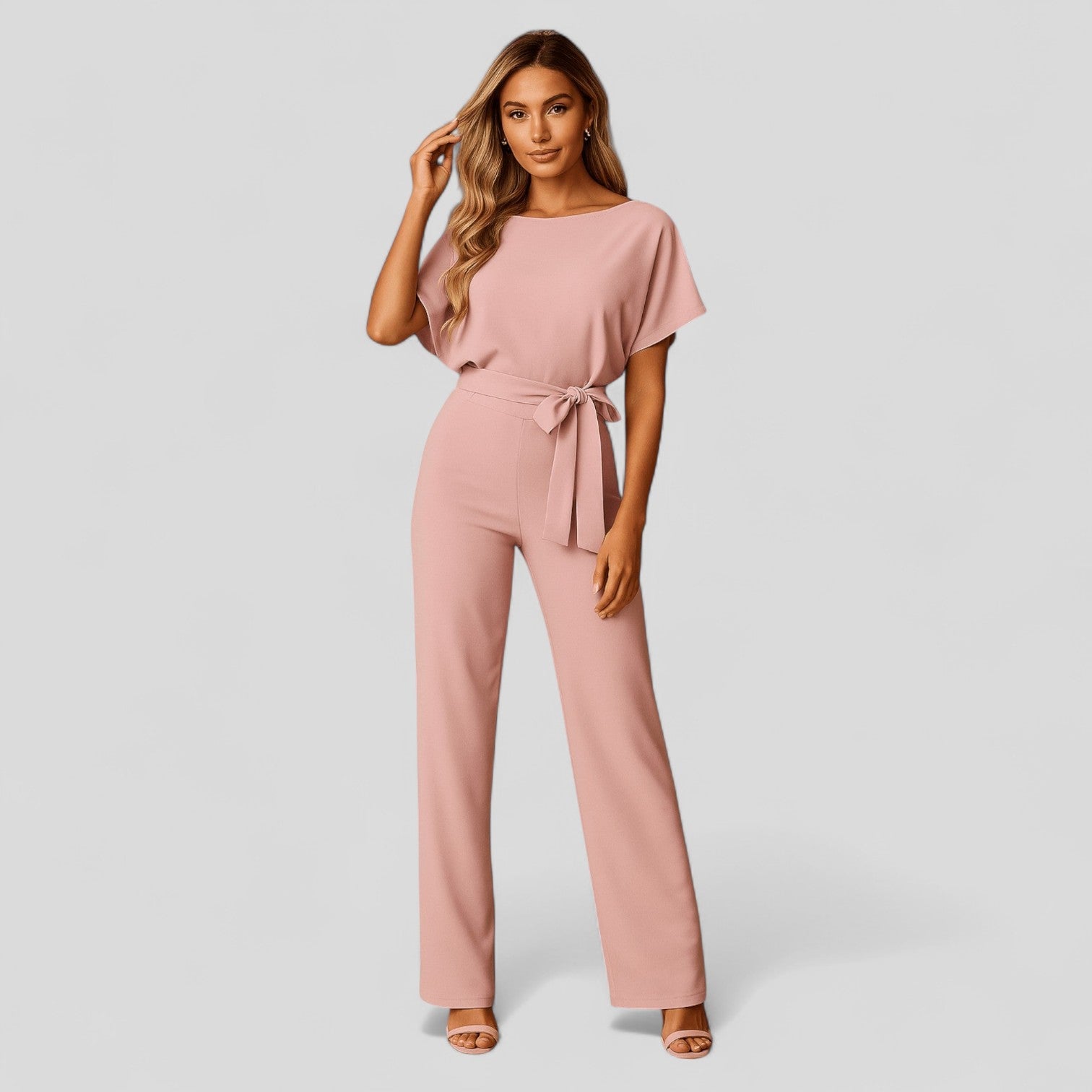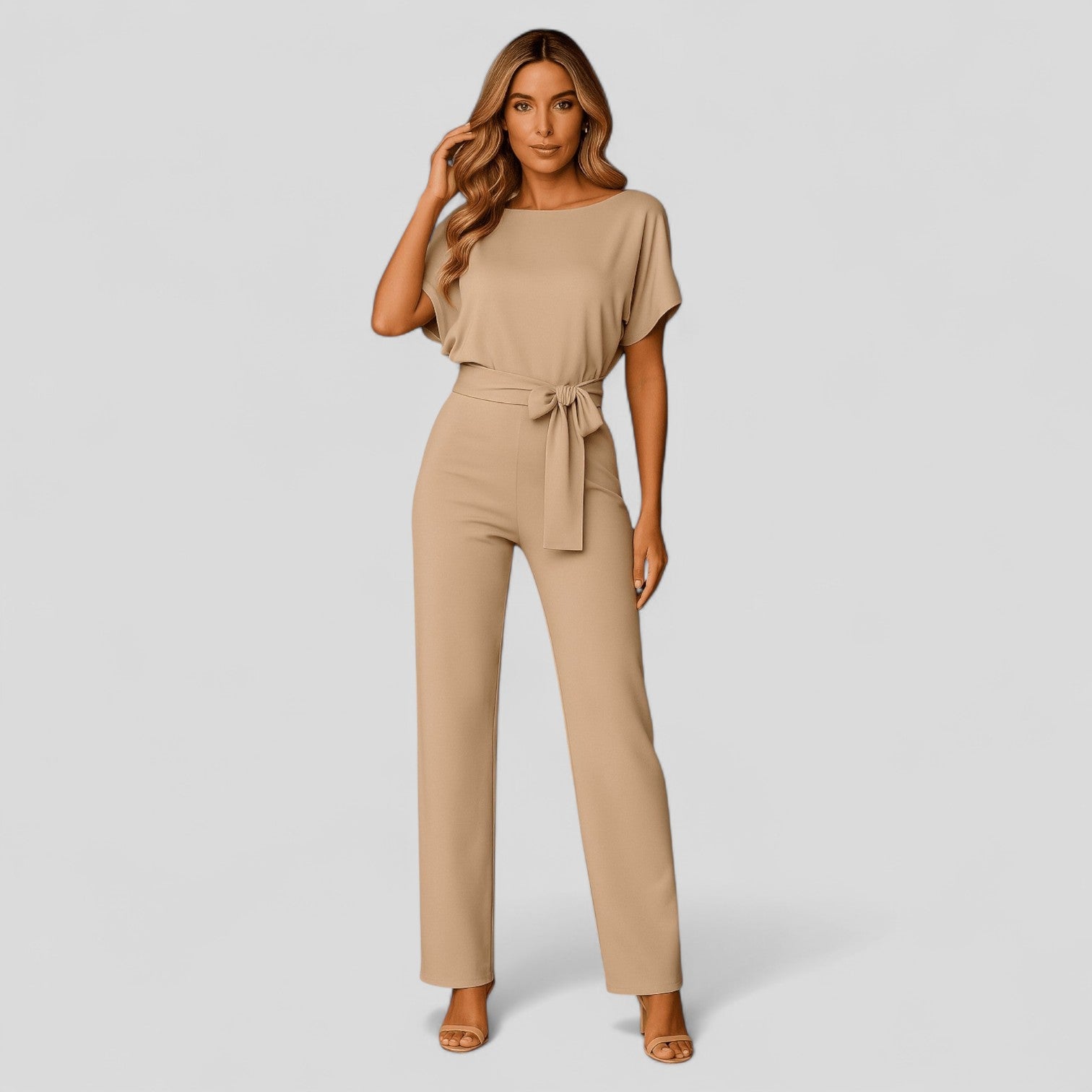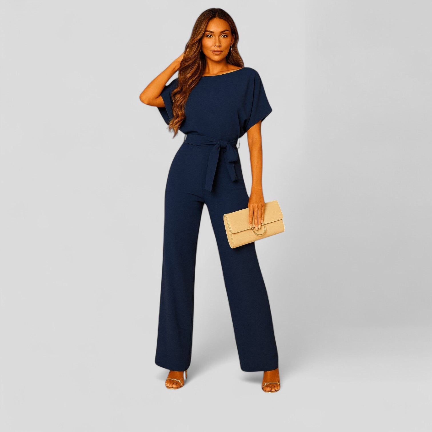 Elegante mono con una silueta fluida y un corte favorecedor que resalta la figura de manera sutil. La parte superior presenta un escote amplio y mangas cortas que caen sueltas, ofreciendo máxima comodidad. El cinturón ajustable define y realza la cintura, permitiendo un ajuste personalizado. Las piernas anchas del pantalón alargan visualmente las piernas, brindando una ligereza aireada.