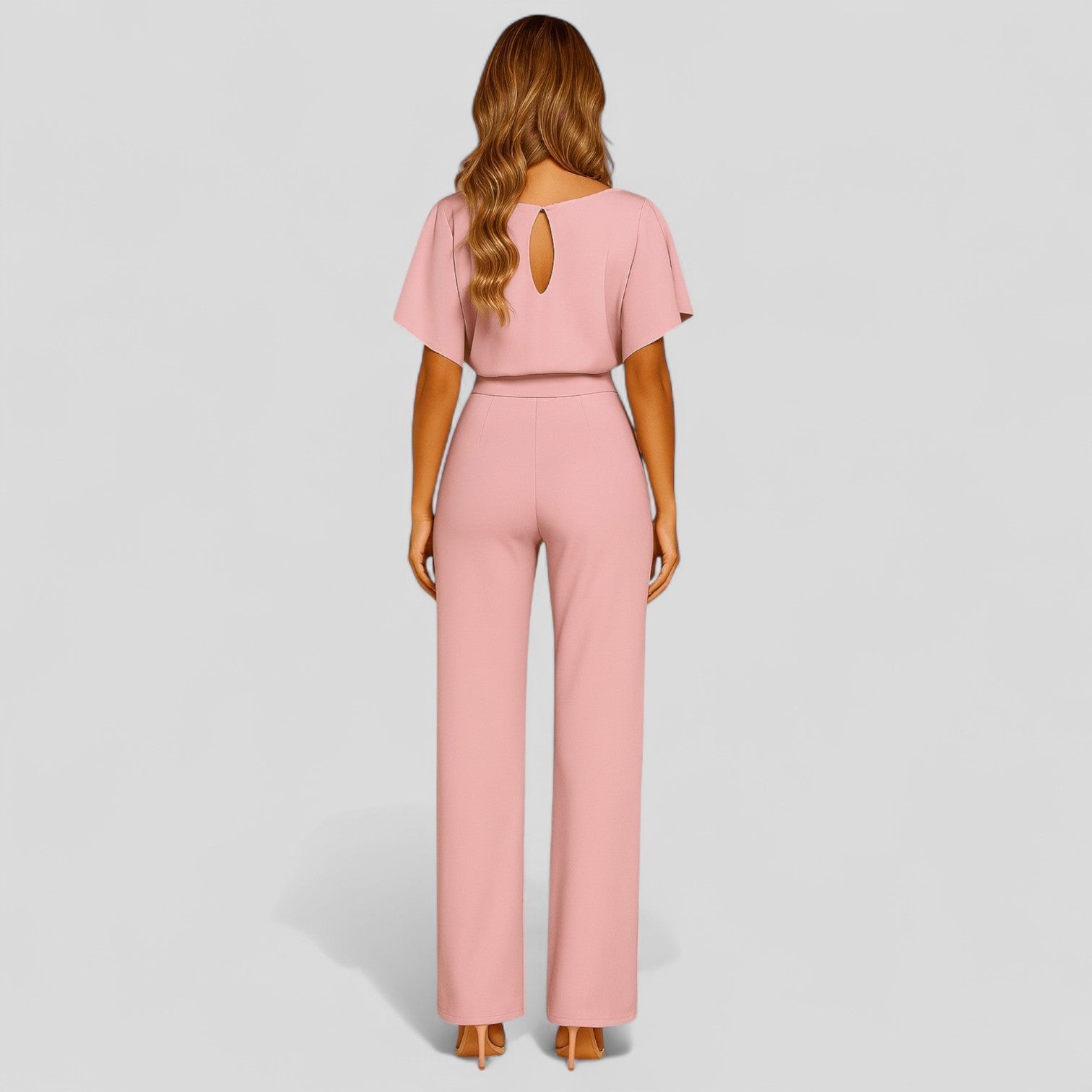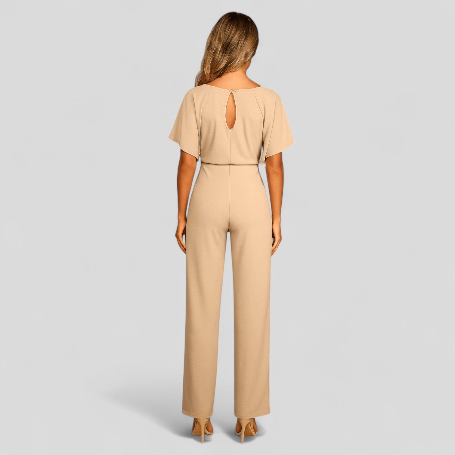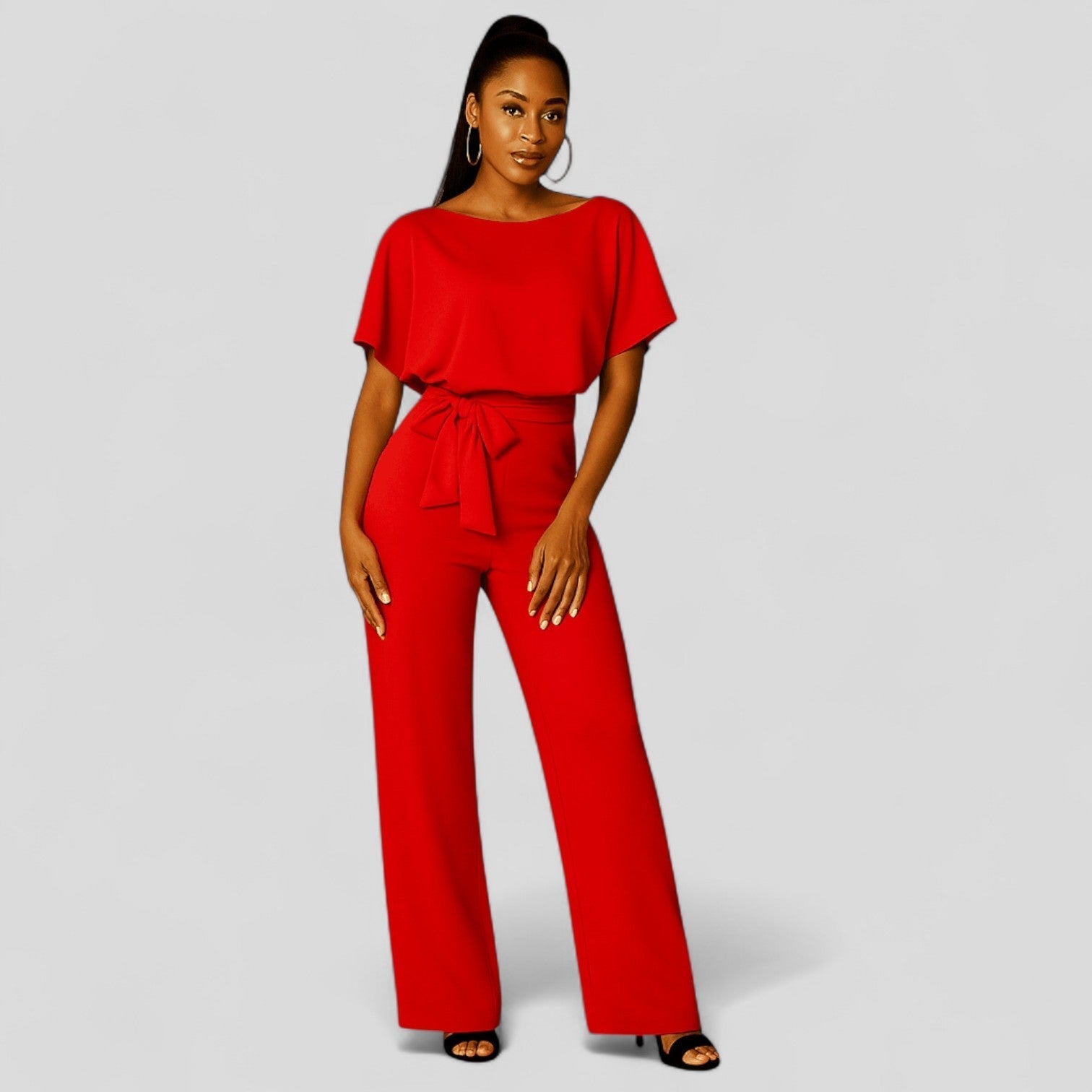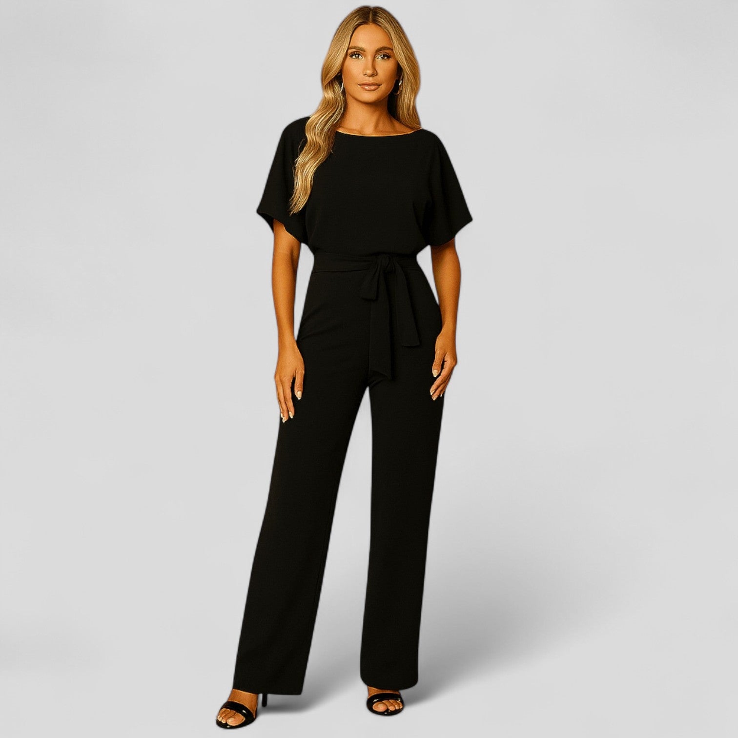 Elegante mono con una silueta fluida y un corte favorecedor que resalta la figura de manera sutil. La parte superior presenta un escote amplio y mangas cortas que caen sueltas, ofreciendo máxima comodidad. El cinturón ajustable define y realza la cintura, permitiendo un ajuste personalizado. Las piernas anchas del pantalón alargan visualmente las piernas, brindando una ligereza aireada.
